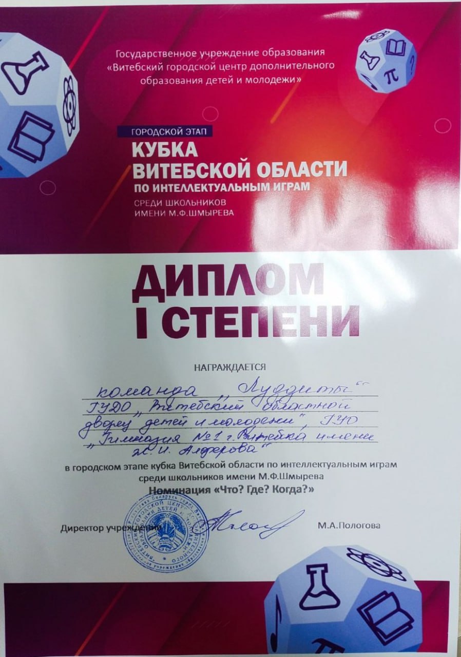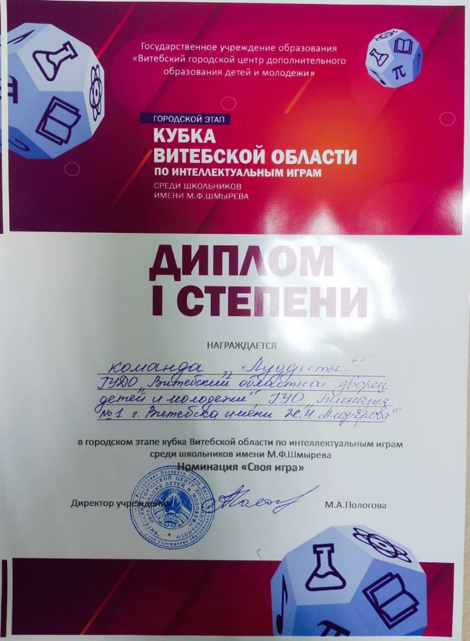 05.12.2025Команда интеллектуальных игр «Луддиты» гимназии №1 стала победителем городского этапа кубка Витебской области по интеллектуальным играм среди школьников имени М.Ф.Шмырева, завоевав дипломы I степени в номинациях «Своя игра» и «Что? Где? Когда?».