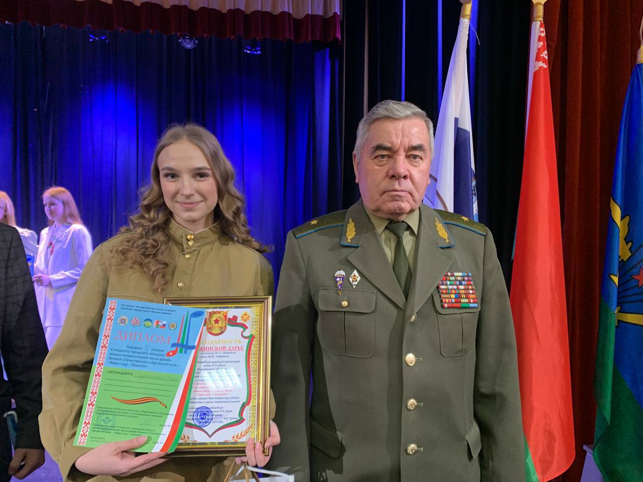 Поздравляем учащуюся 10 «А» Збуржинскую Дарью, которая стала лауреатом городского конкурса военно-патриотической песни времен Великой Отечественной и Афганской войн – «Через года – Помните!»